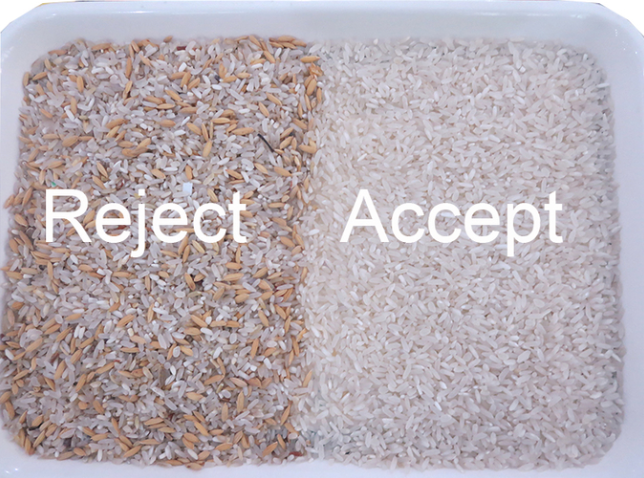 Raw materials are put into the machine from its material hopper on the top, vibrated by vibratiory feeder and sliding along material chute into the zone of observation in sorting chamber through sensors and background plate. Under the effect of lamps source, CCD sensor receives compound light from materials being sorted. According to the light intensity and color changes, make the system produce output signal and drive solenoid valve(ejector) to work, ejecting the discolor grain to reject chamber and good materials continue to fall into the finished accept chamber